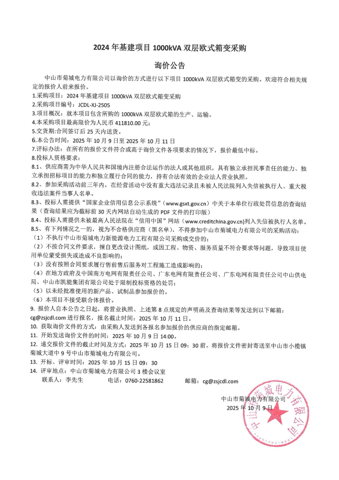 2024年基建项目1000kVA双层欧式箱变采购询价公告