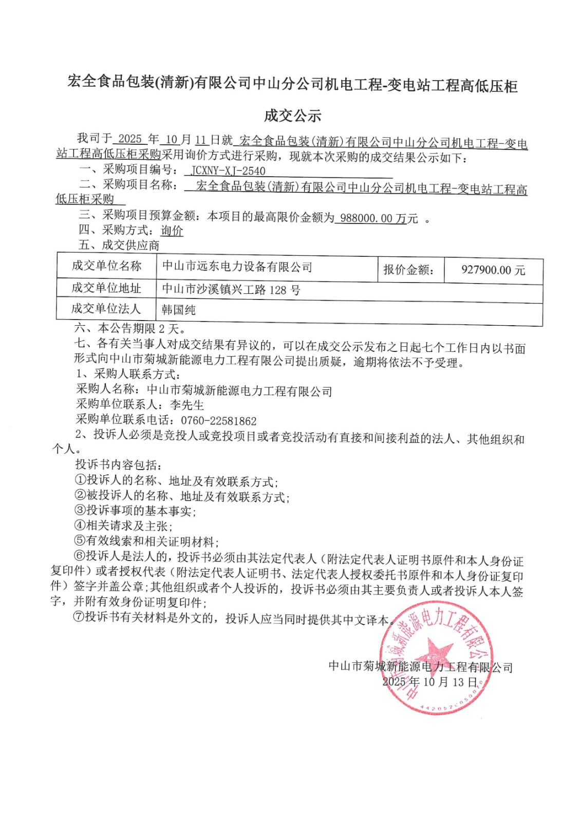 宏全食品包装(清新)有限公司中山分公司机电工程-变电站工程高低压柜成交公示