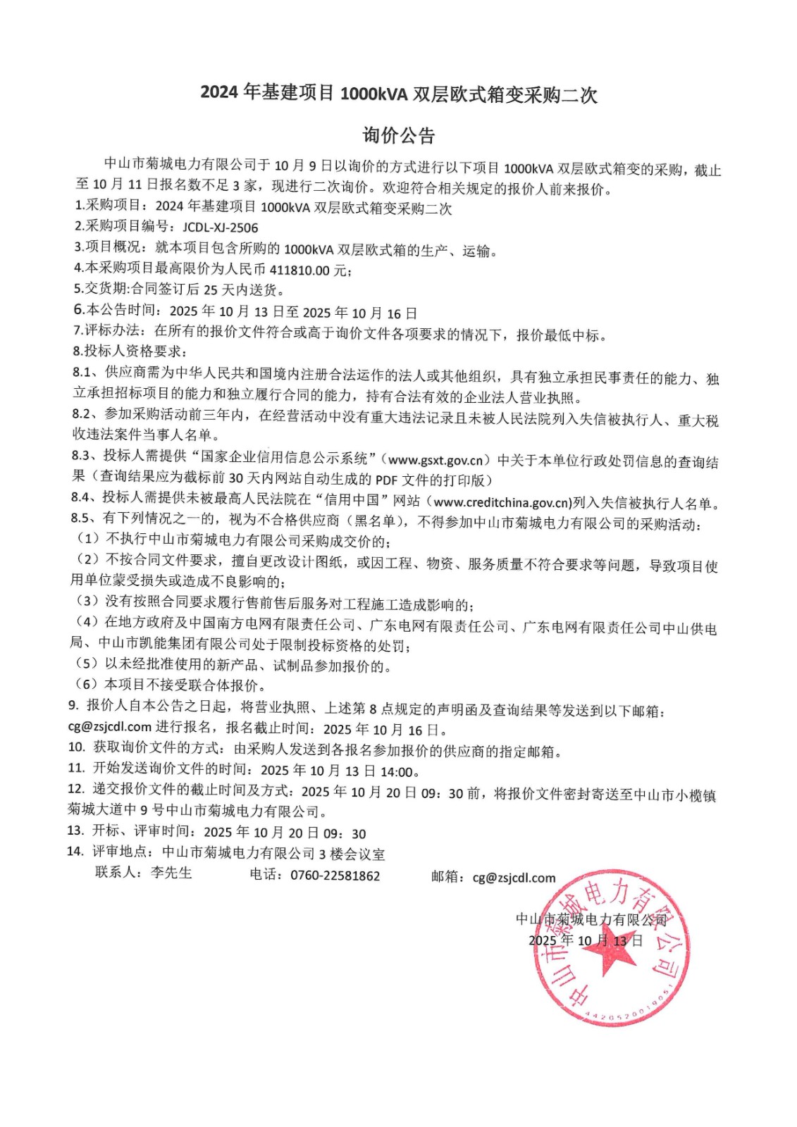 2024年基建项目1000kVA双层欧式箱变采购二次询价公告
