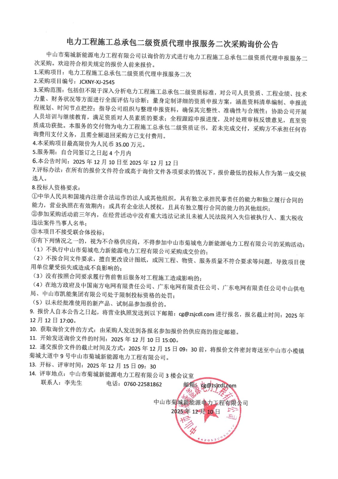电力工程施工总承包二级资质代理申报服务二次采购询价公告