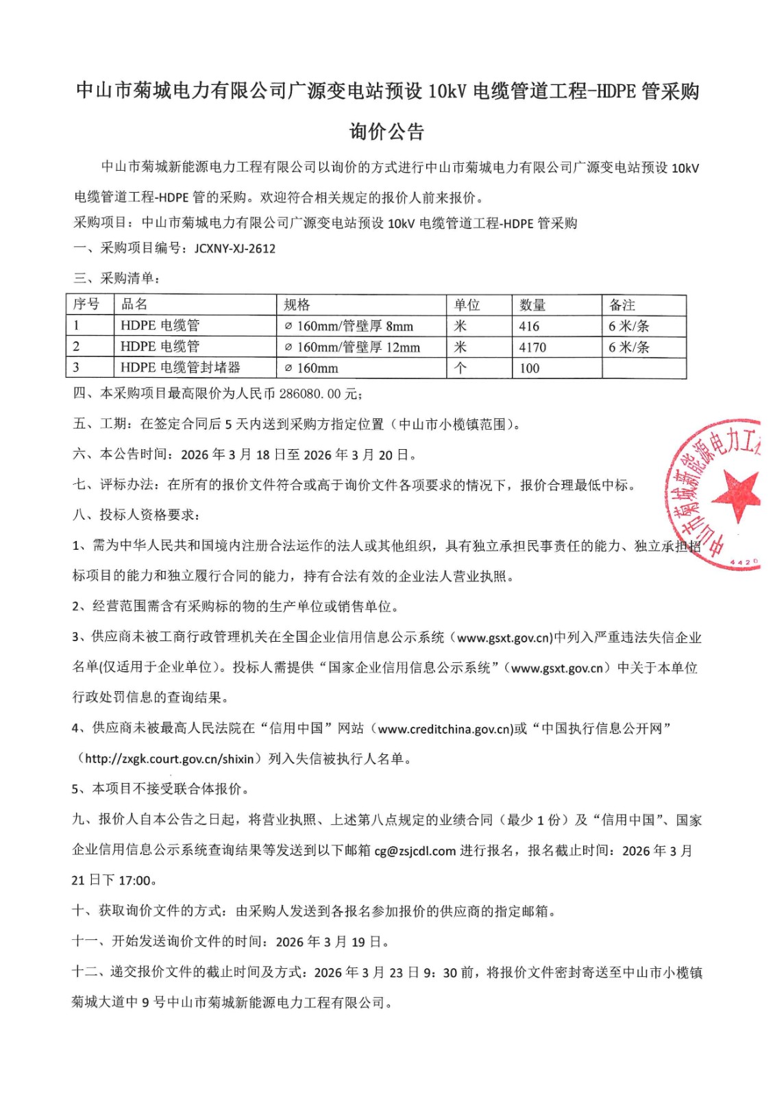 中山市菊城电力有限公司广源变电站预设10kV电缆管道工程-HDPE管采购询价公告
