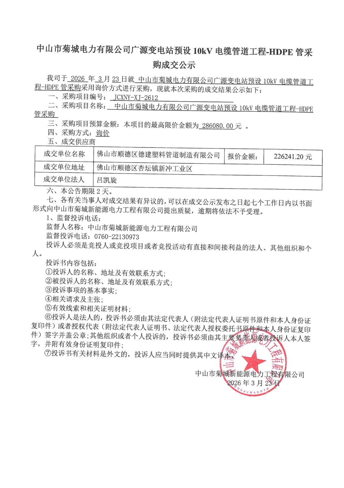 中山市菊城电力有限公司广源变电站预设10kV电缆管道工程-HDPE管采购成交公示