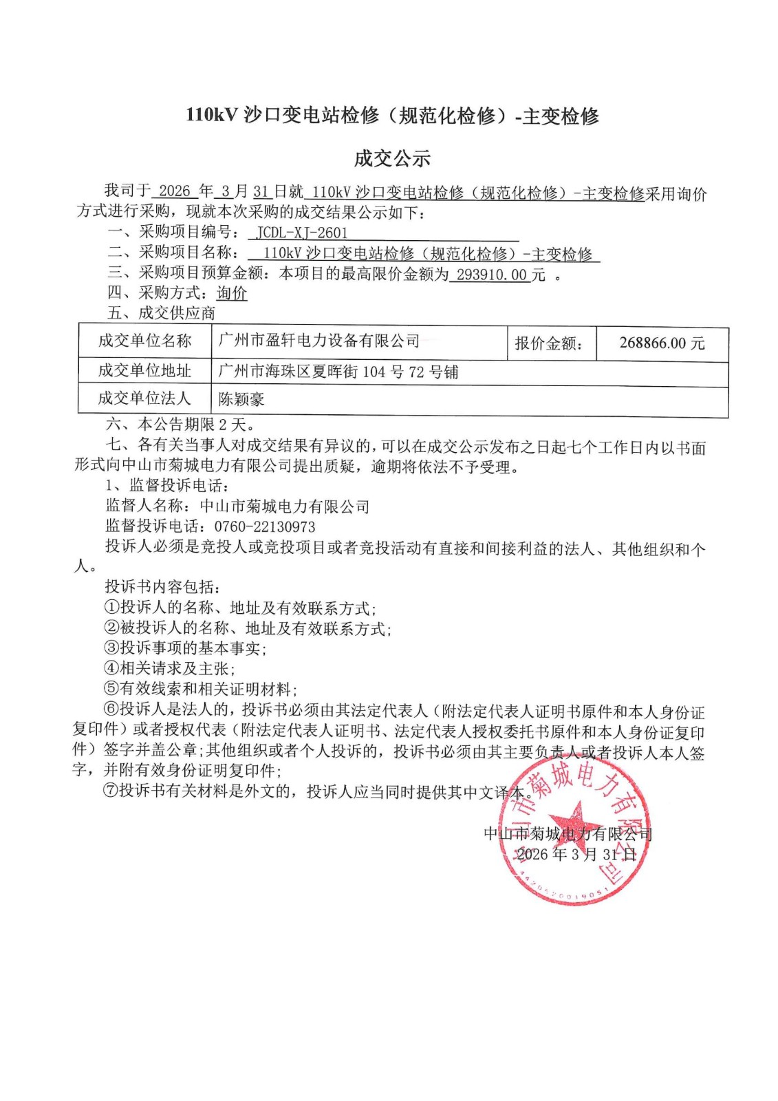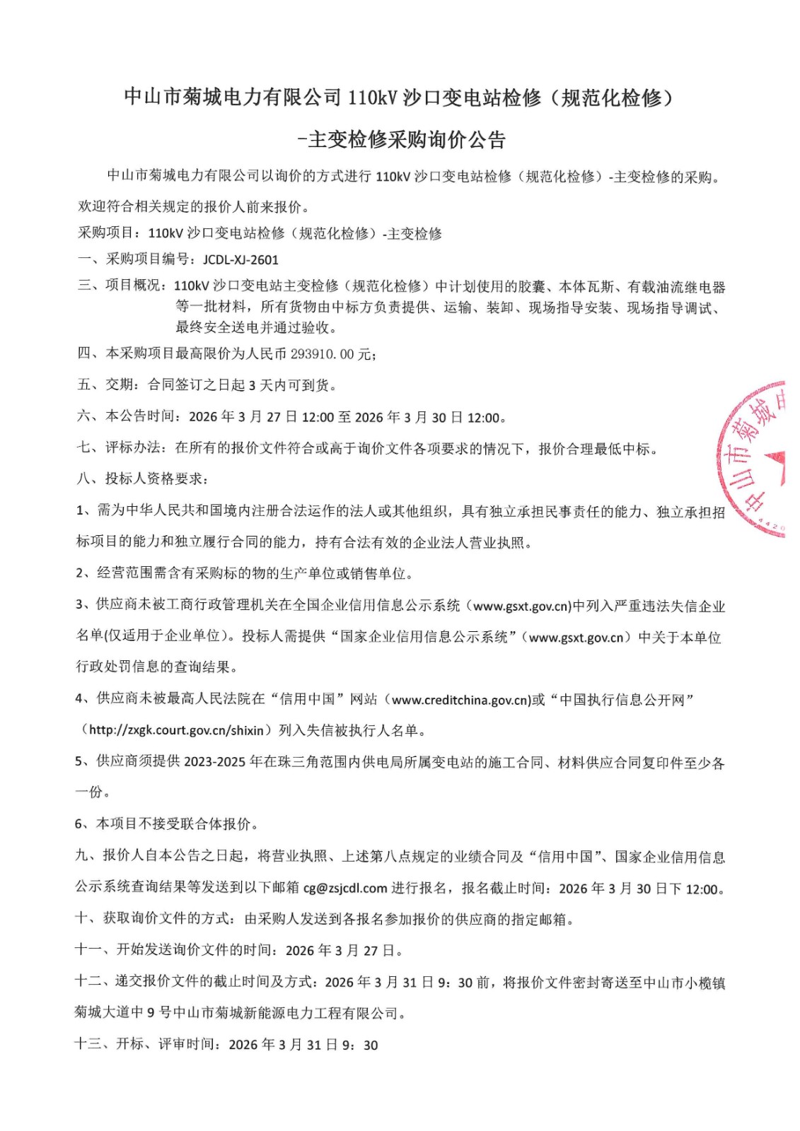 中山市菊城电力有限公司110kV沙口变电站检修(规范化检修)-主变检修采购询价公告