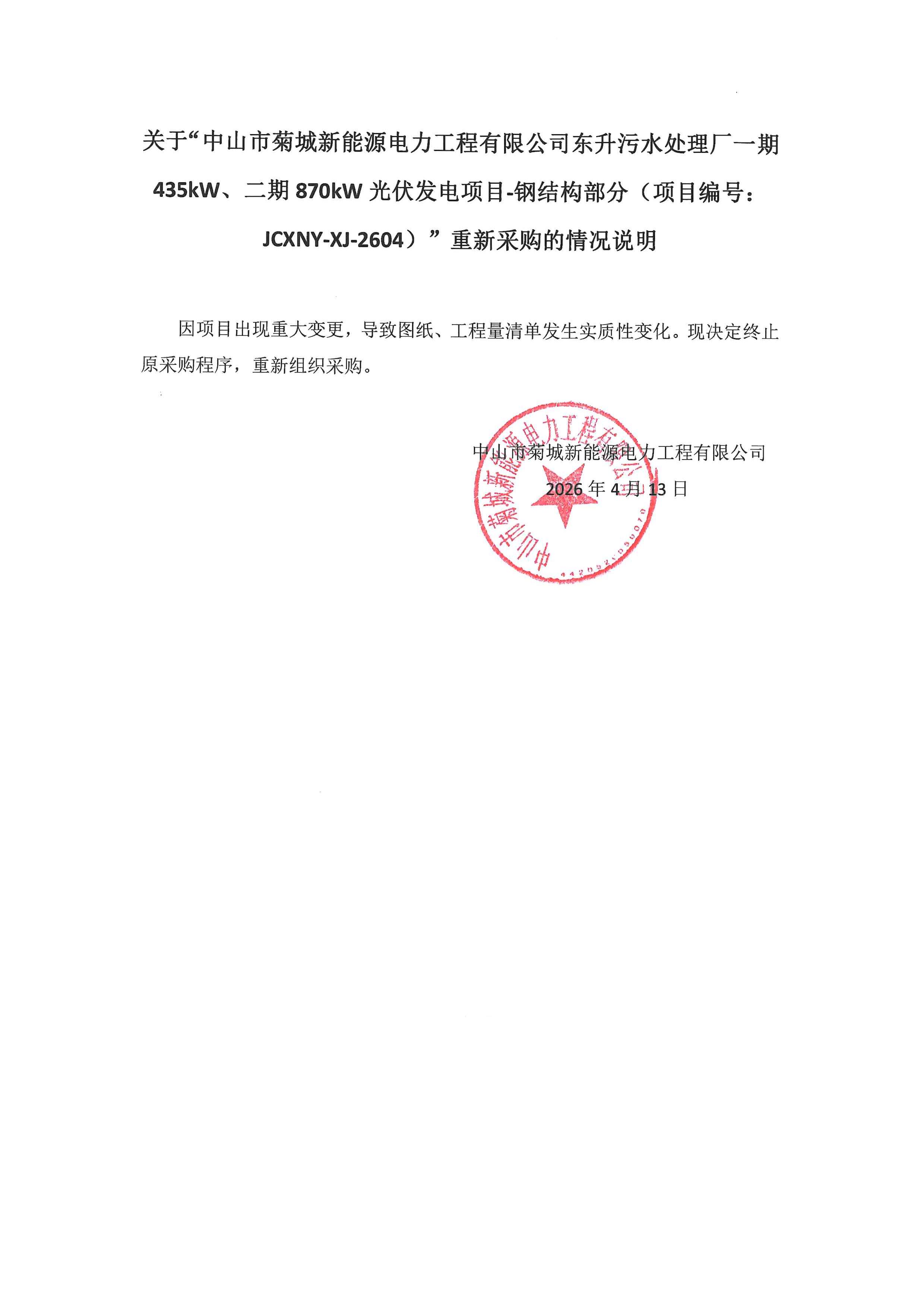 中山市菊城新能源电力工程有限公司东升污水处理厂一期435kW、二期870kW光伏发电项目-钢结构部分重新采购的情况说明