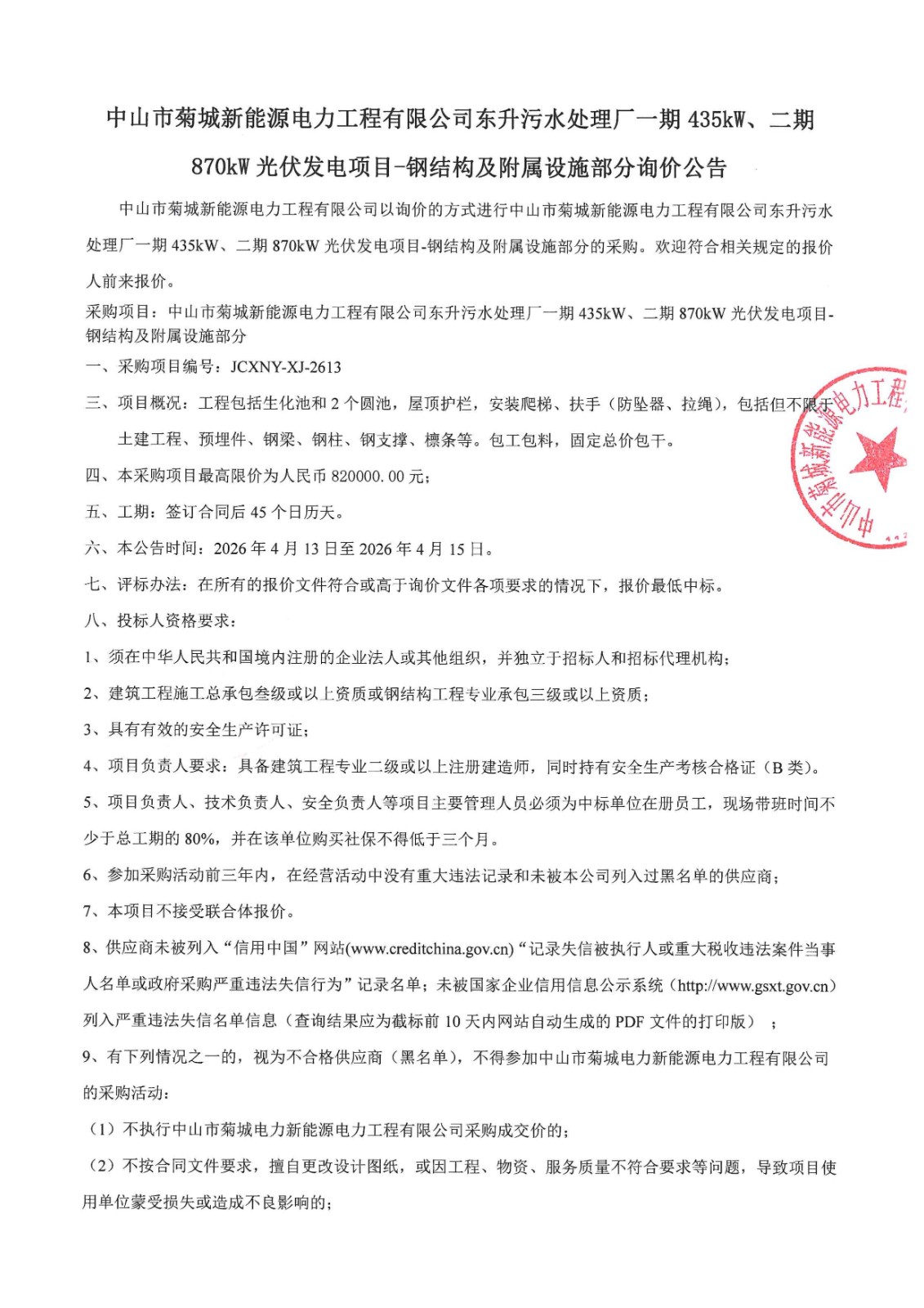 中山市菊城新能源电力工程有限公司东升污水处理厂一期435kW、二期870kW光伏发电项目-钢结构及附属设施部分询价公告