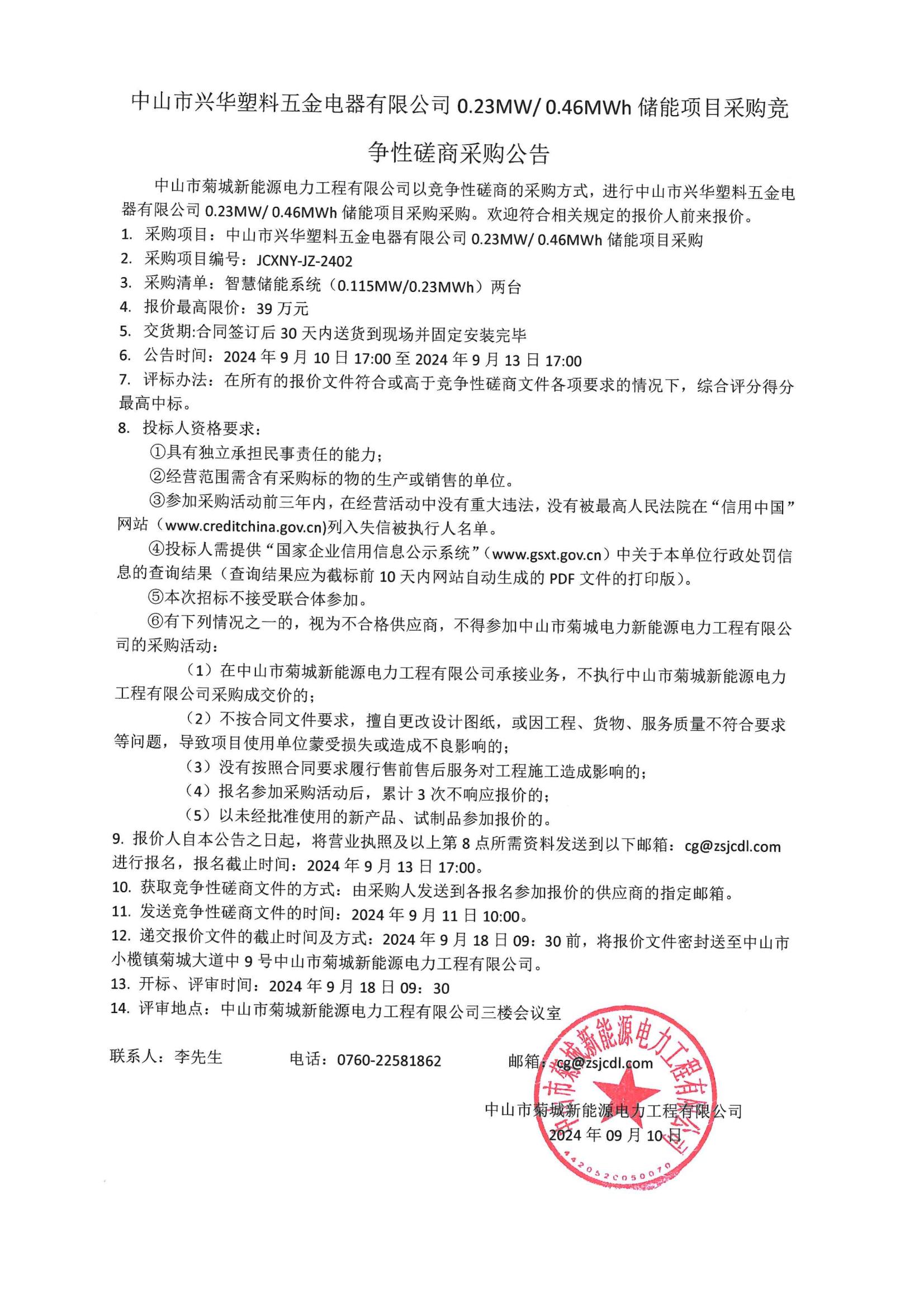 中山市兴华塑料五金电器有限公司0.23MW/0.46MWh储能项目采购竞争性磋商采购公告
