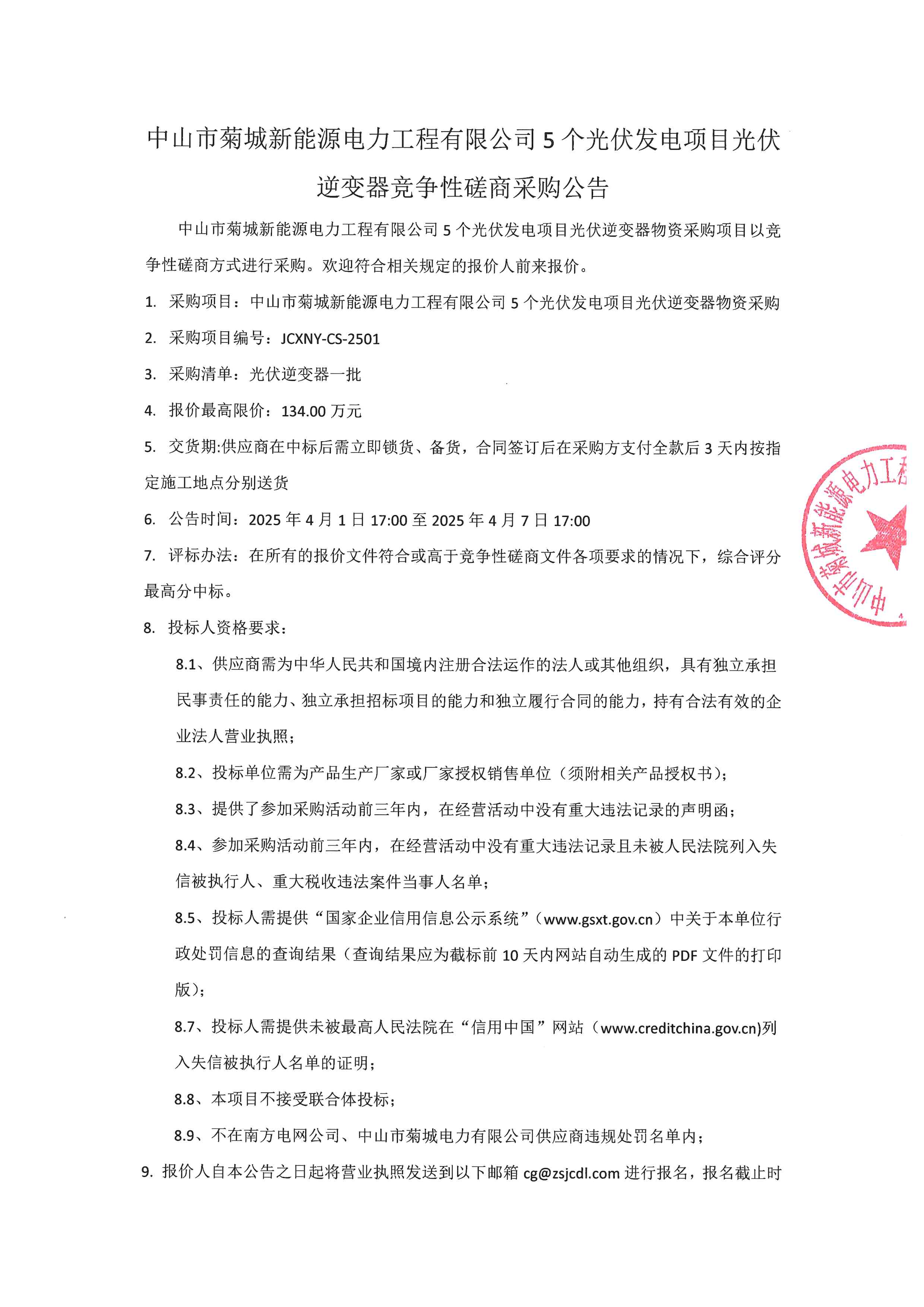 中山市菊城新能源电力工程有限公司5个光伏发电项目光伏逆变器竞争性磋商采购公告
