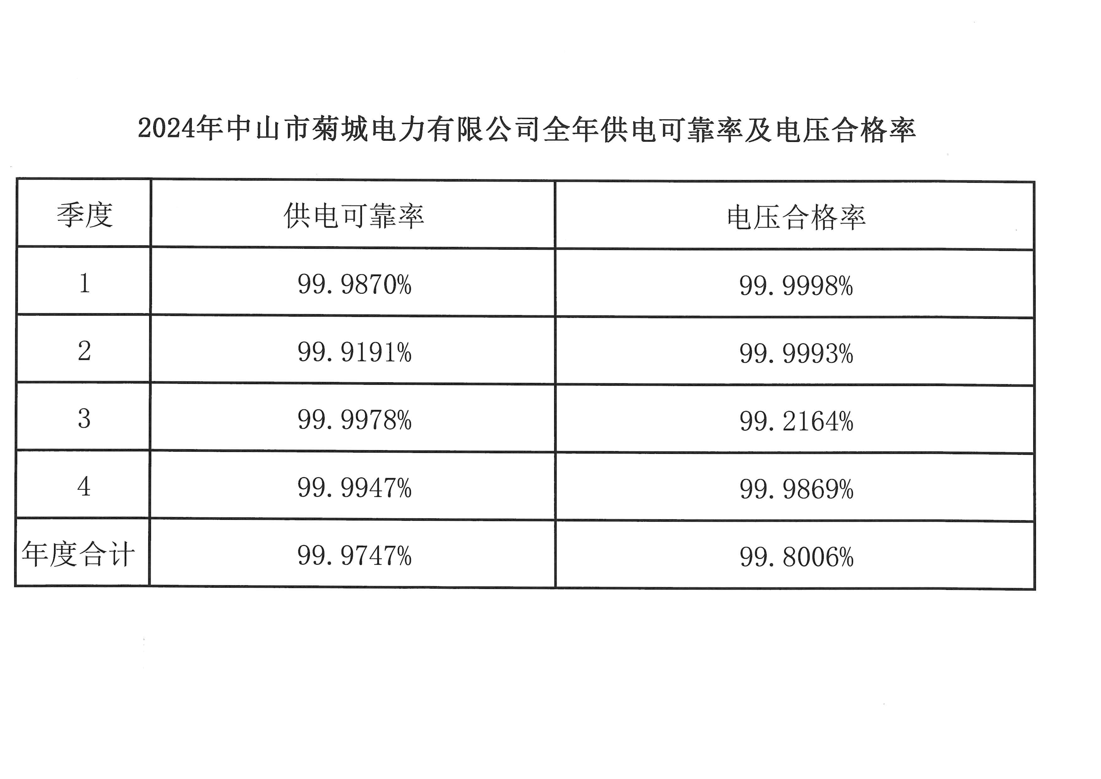 2024年中山市菊城电力有限公司全年供电可靠率及电压合格率