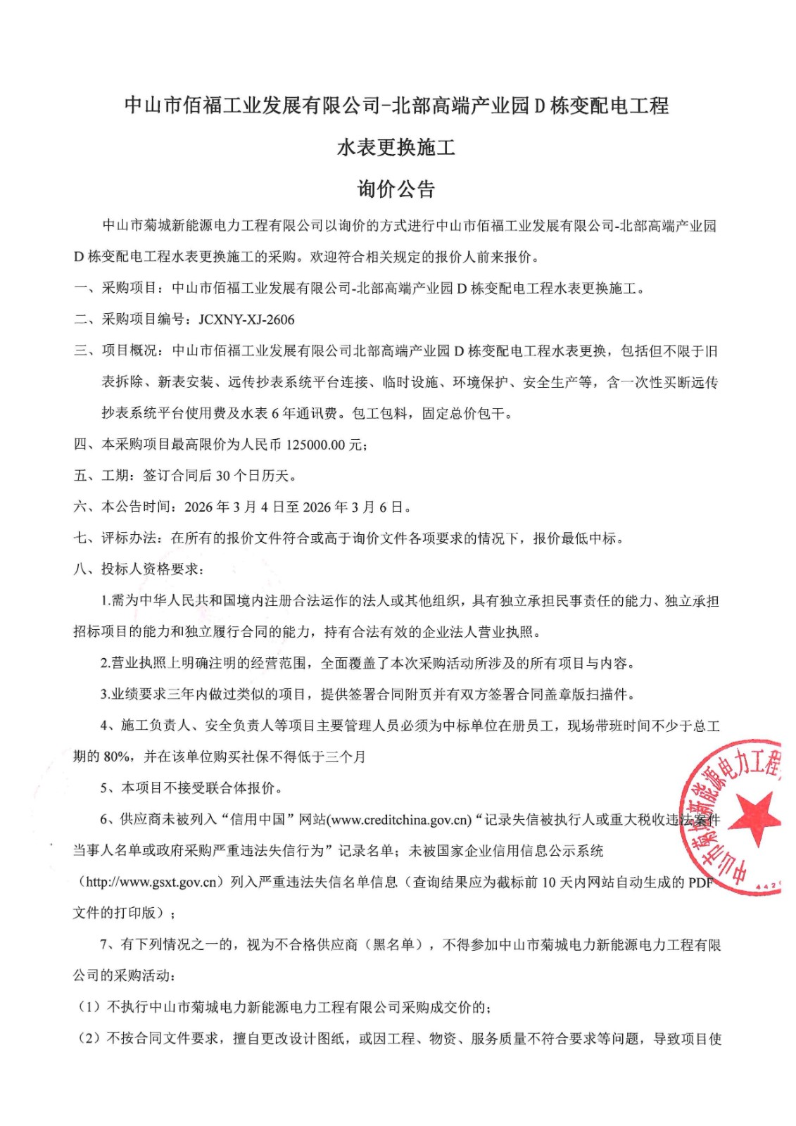 中山市佰福工业发展有限公司-北部高端产业园D栋变配电工程水表更换施工询价公告